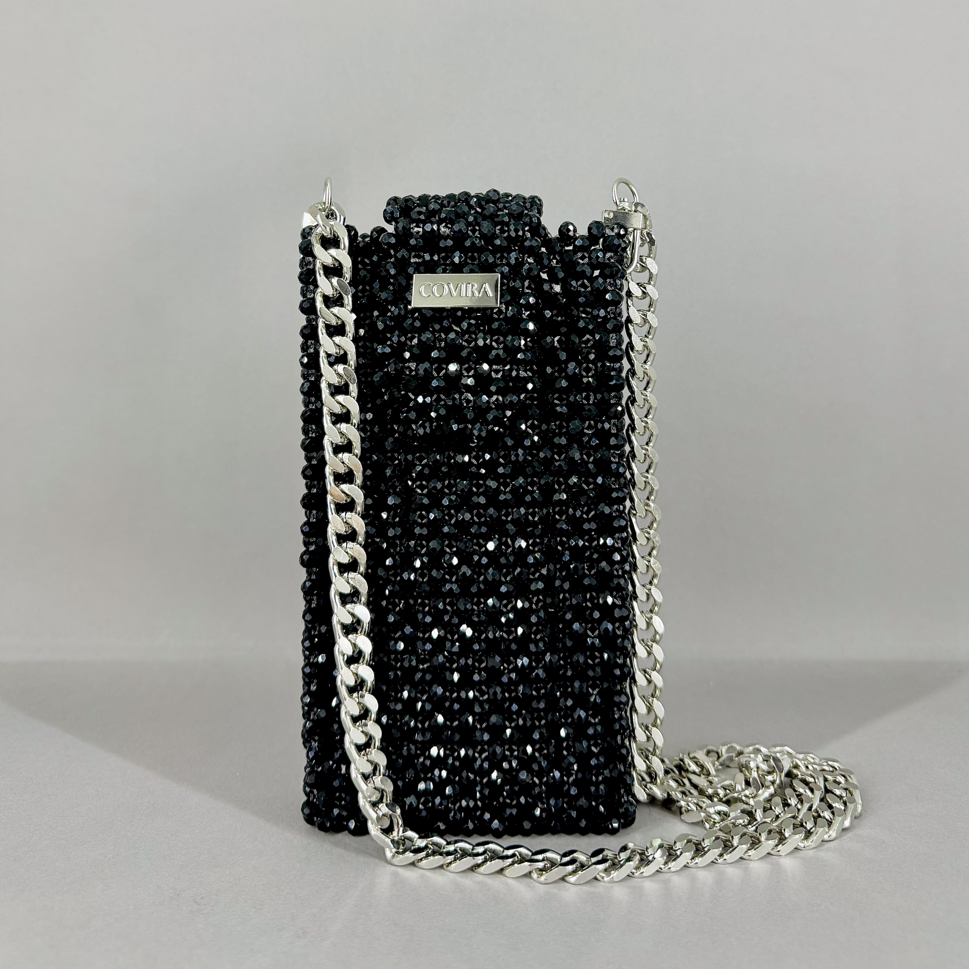 Immerse yourself in the captivating allure of midnight with the Black Aurora mobile bag. This refined accessory is masterfully hand-crafted with jet-black crystal beads that glisten like a star-studded sky. Each facet reflects a subtle sparkle, creating a striking contrast against the deep, rich backdrop. The structured silhouette is designed to cradle your phone and small essentials in luxury, while the bold silver chain elevates every ensemble—from evening glam to modern daywear.