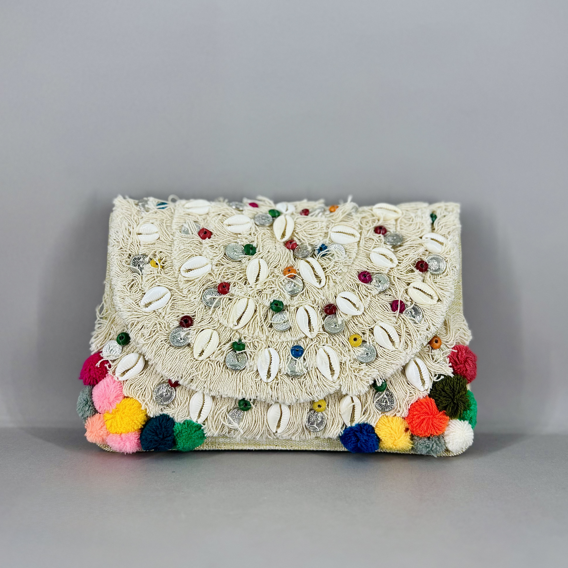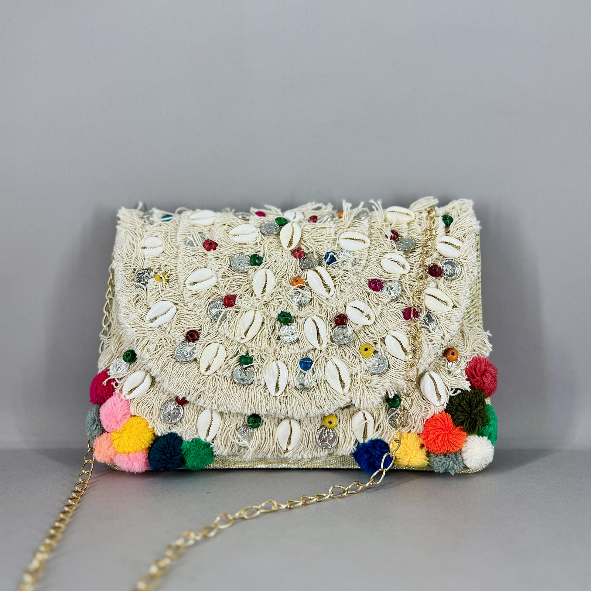 Dance through the nine nights of celebration with the Boho Tide, a statement clutch that perfectly complements the vibrant spirit of Navratri. Hand-embellished with cowrie shells, playful pom-poms, and sparkling mirrors, it reflects the energy of garba nights and festive traditions. Pair it with your chaniya choli or fusion wear, and let it add the perfect bohemian luxe touch to your look.