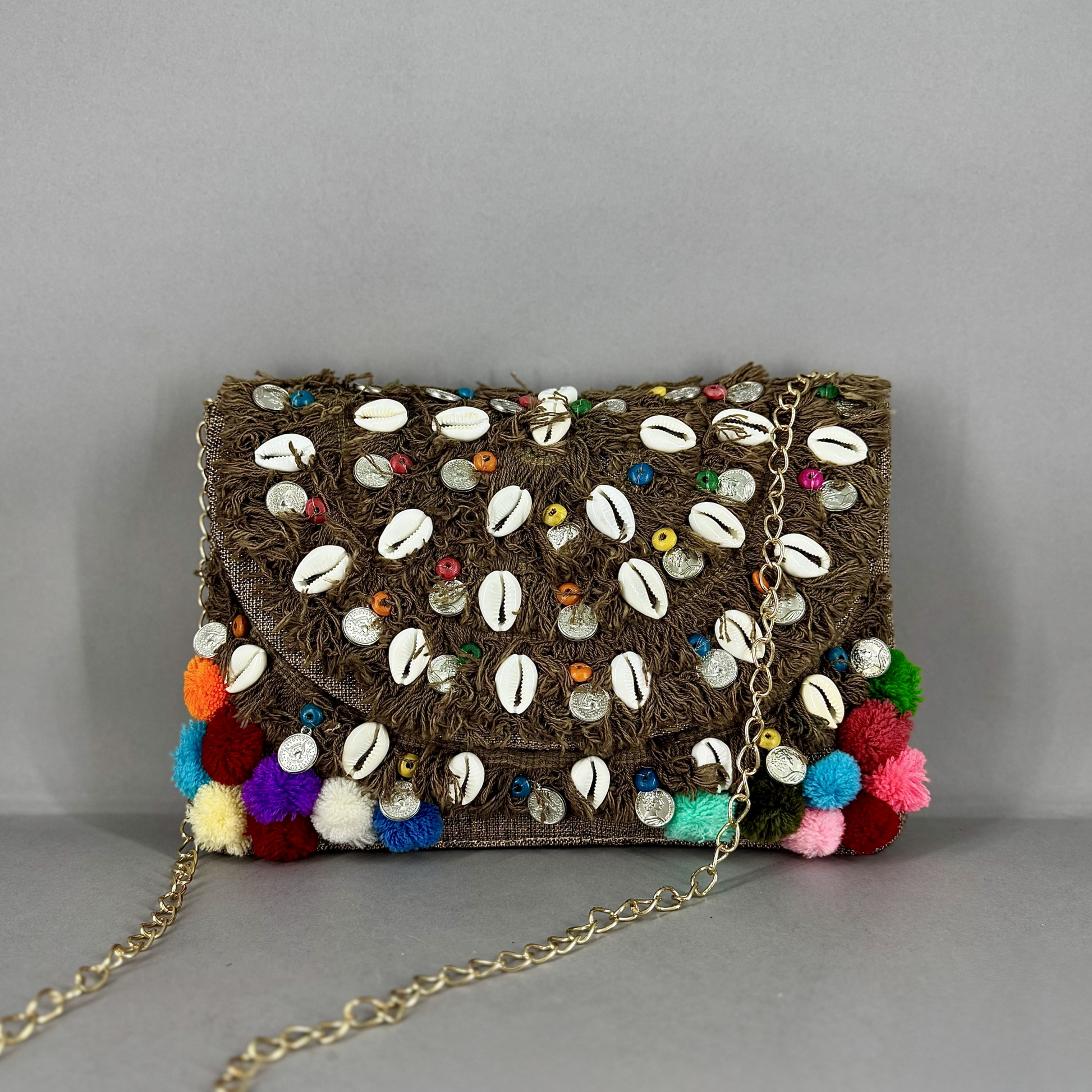 Bring the rhythm of the tides into your style with Boho Tide – rustic brown. Handcrafted with earthy brown threads, adorned with natural cowrie shells, multicolor beads, and vibrant pom-poms in hues of red, green, yellow, pink, blue, orange, and white – this bohemian statement bag captures the free-spirited charm of coastal artistry. Finished with a sleek golden chain strap, it’s the perfect blend of tradition and trend for every wanderer at heart.