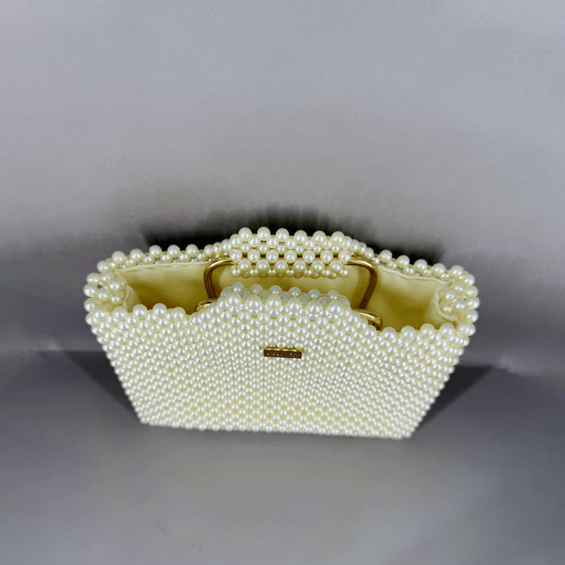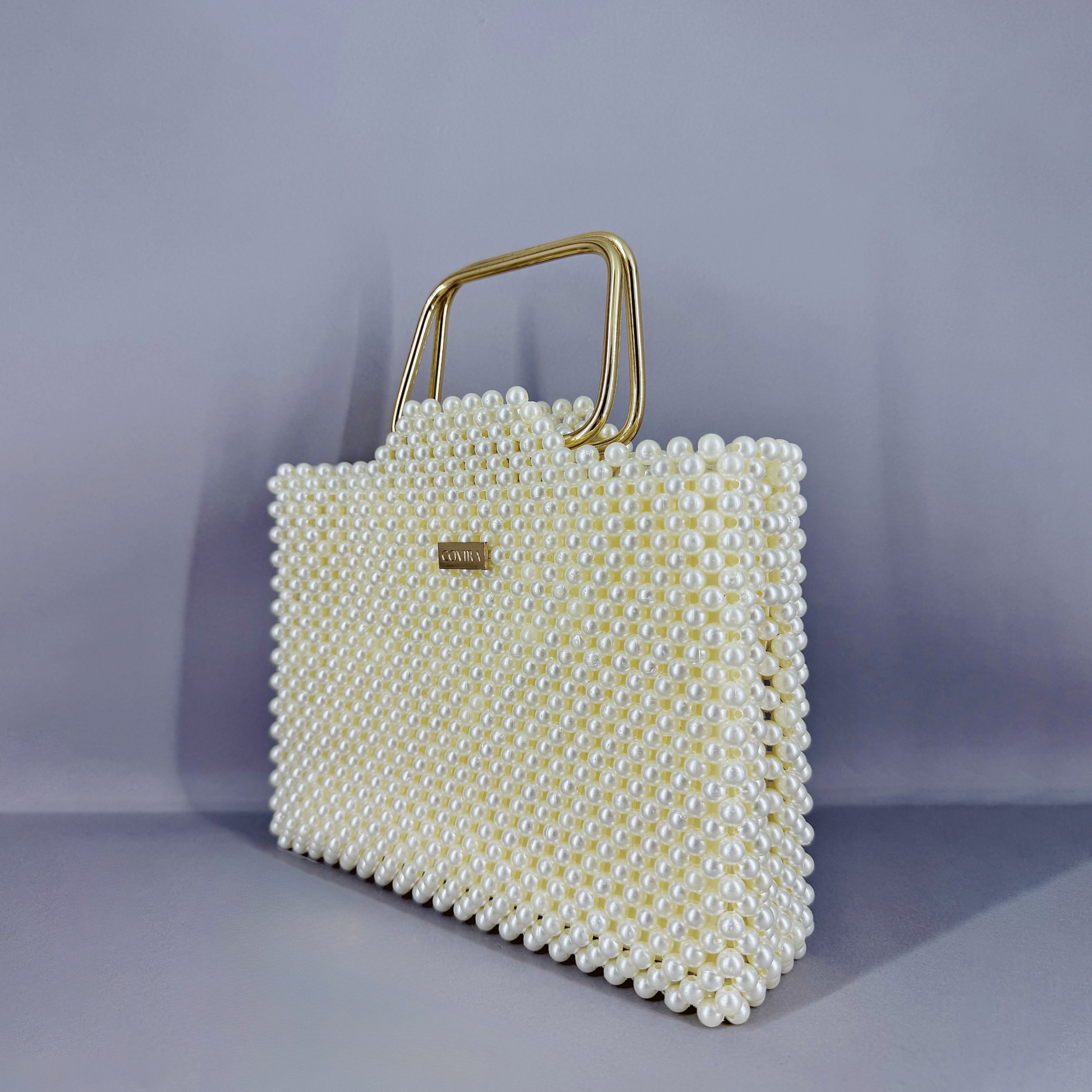 Grace meets glamour in the Oyster Bloom handbag, a masterpiece adorned with luminous white pearl beads that exude timeless elegance. Its refined silhouette is complemented by a chic gold handle and a subtle brand emblem, making it the perfect statement accessory for both day and evening ensembles.