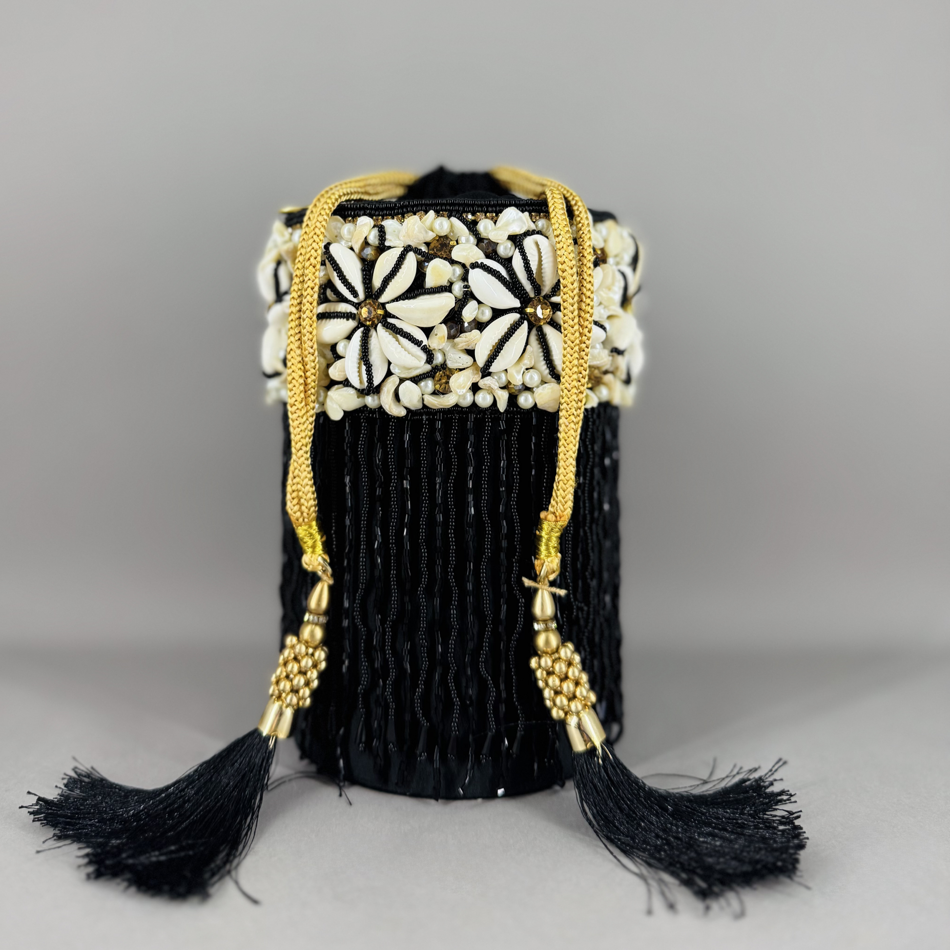 Step into timeless elegance with Shellaara – Noir Luxe. This handcrafted potli features blooming cowrie shell florals on a rich black base, accented with ivory stones, golden beads, and statement tassels. The cascading fringes add a luxe bohemian vibe, while the drawstring closure ensures practicality with style. Perfect for weddings, festive nights, or evening soirées – this potli is couture reimagined with coastal charm.